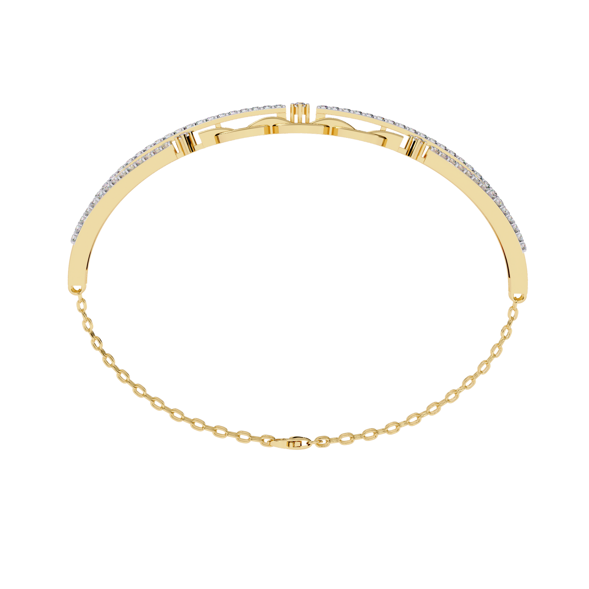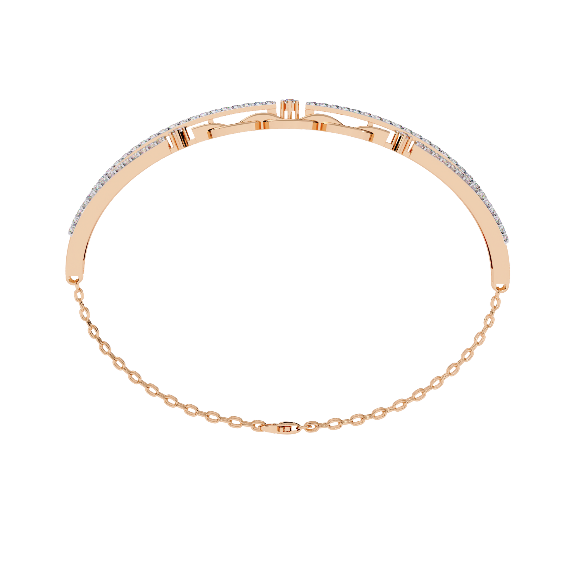 This stylish rose gold bracelet features a striking combination of pavé-set diamond double bars and bold interlocking chain links, accented with a delicate double chain for added dimension. Crafted in 9kt, 9kt, 14kt & 18kt, or 18kt gold, the design marries modern sophistication with timeless glamour, highlighting the brilliance of ethically sourced lab grown diamonds. Perfect for stacking or statement wear, this piece exudes contemporary elegance and versatile luxury.
