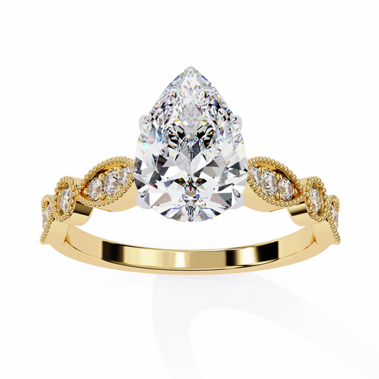 Regular price From Rs. 51,180Regular priceUnit price / perSale price From Rs. 51,180This beautifully detailed ring features a sparkling lab grown pear cut diamond set in warm rose gold, accented by milgrain borders, marquise-shaped patterns, and glittering diamonds along the band. The teardrop outline of the pear cut brings a graceful and feminine touch to the antique-inspired craftsmanship, making this ring a poetic reflection of enduring love and individuality—perfect for the Ophira collection’s timeless narratives.