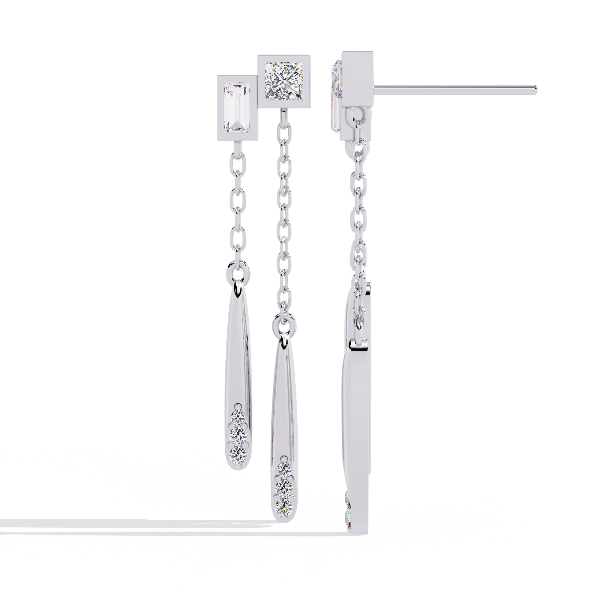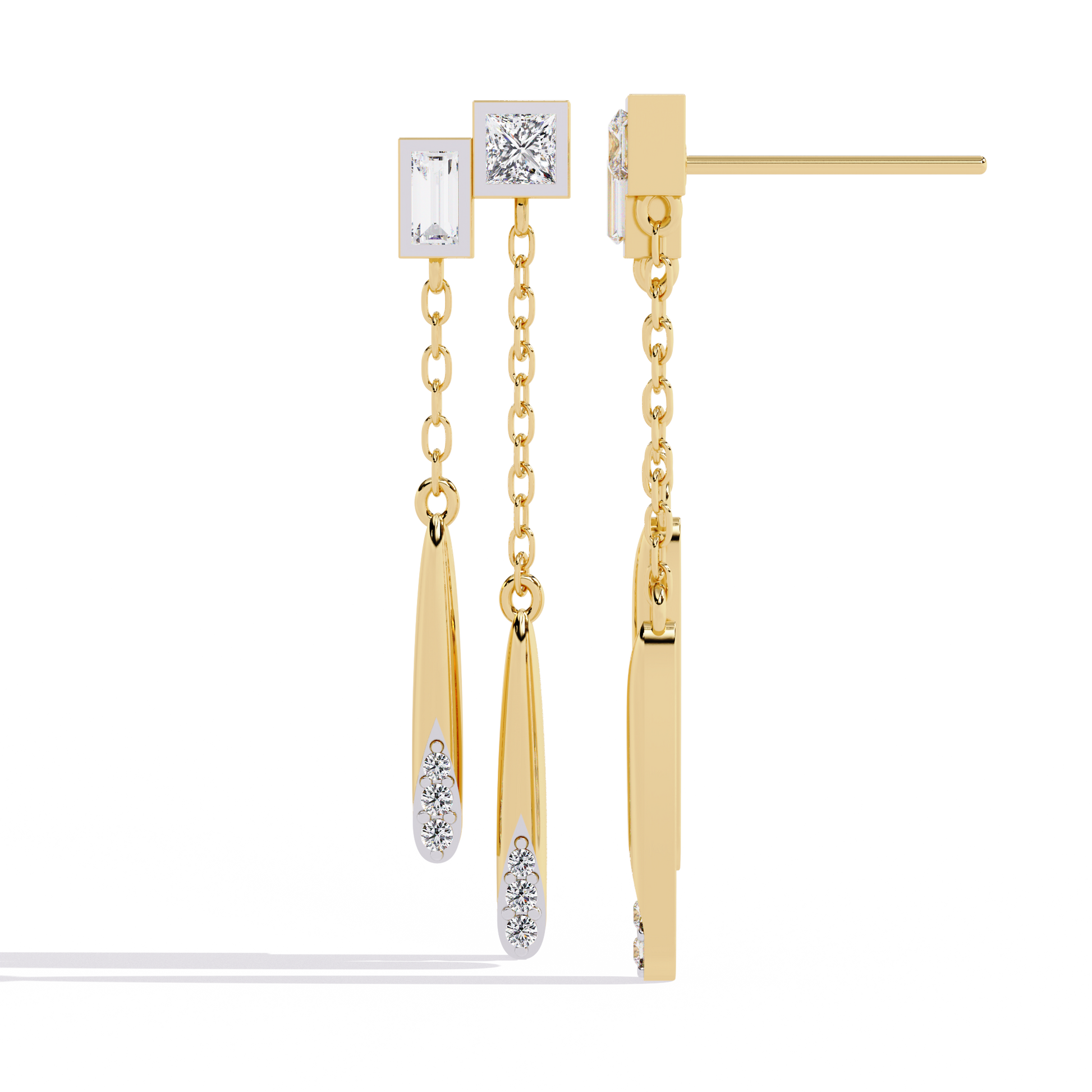 The Cosmo Geometric Chain Drop Lab Grown Diamond Earrings spotlight crisp square and rectangle motifs set with princess and baguette lab grown diamonds, paired with dainty gold chains and polished bar drops tipped in sparkling accents for dimensional movement. Handcrafted in 9kt, 14kt, & 18kt, 18kt, or 9kt BIS-hallmarked gold—yellow, rose, or white—these earrings exude modern luxury, architectural style, and effortless elegance. IGI/GIA-certified stones and Ophira's signature finishing make this design ideal for fresh layering, gifting, or elevating a chic daily style.